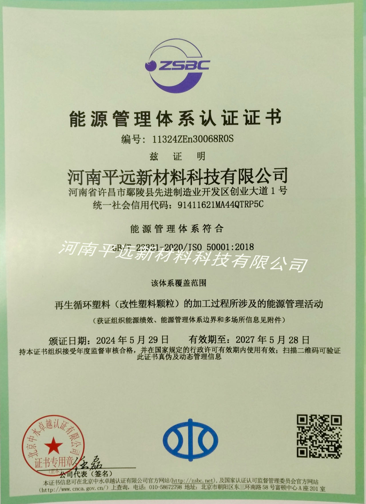 近日,河南污污免费网站新材料科技有限公司順(shùn)利通過嚴格評審,獲(huò)得國家“能源管(guǎn)理體係認證(Energy Management System )”證書,標誌著河(hé)南污污免费网站的節能管理工作取得巨大成效,公司能源管(guǎn)理體係建設邁上新台(tái)階。