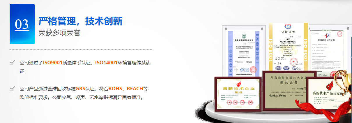河南(nán)污污免费网站新材料科技(jì)有限公司(sī)已通過ISO9001質量體係、14001環境體係、45001職(zhí)業健(jiàn)康安全管理體係認證;GRS全球回收標準(zhǔn)認證;美國UL OBP 2809趨海塑料認證;BSCI商業社會標準認證;LCA生命周期認證。
