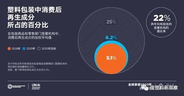 《全球承諾2020進展報告》顯示,簽署(shǔ)方(fāng)在兩大領域(yù)實現了顯著的進展:塑料包裝使用(yòng)再生成(chéng)分;逐漸淘汰常見的問題材料和包裝,例如PS和PVC包裝、無法探測到的炭黑顏料和一次性塑料袋和吸(xī)管。